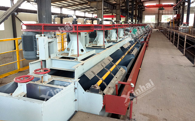 经脱泥后的产物进入浮选作业,锂辉石的浮选工艺流程采用的是一粗-一扫-三精浮选流程,在进入浮选前,浓缩机溢流矿浆先给入搅拌槽中,同时给入药剂搅拌均匀后给入浮选机,完成一粗一扫三精浮选流程,其中精选阶段采用SF型浮选机,中矿依次返回,最终获得合格的锂辉石精矿,而浮选后尾矿部分则进入磁选阶段,通过磁选除铁获得纯度较高(较白)的长石精矿。