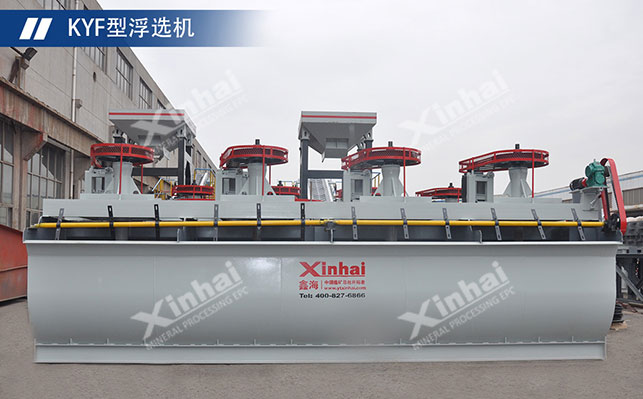 KYF型浮选机是充气式浮选机的一种,槽体结构为U形。突出的特点是:采用了一种新形式的锥形叶轮,叶片后倾,与离心泵的叶轮相似,矿浆处理量大,能耗低。此外,还设有空气分配器,使空气能均匀分散在叶轮周围,扩大矿浆与空气的接触面积。